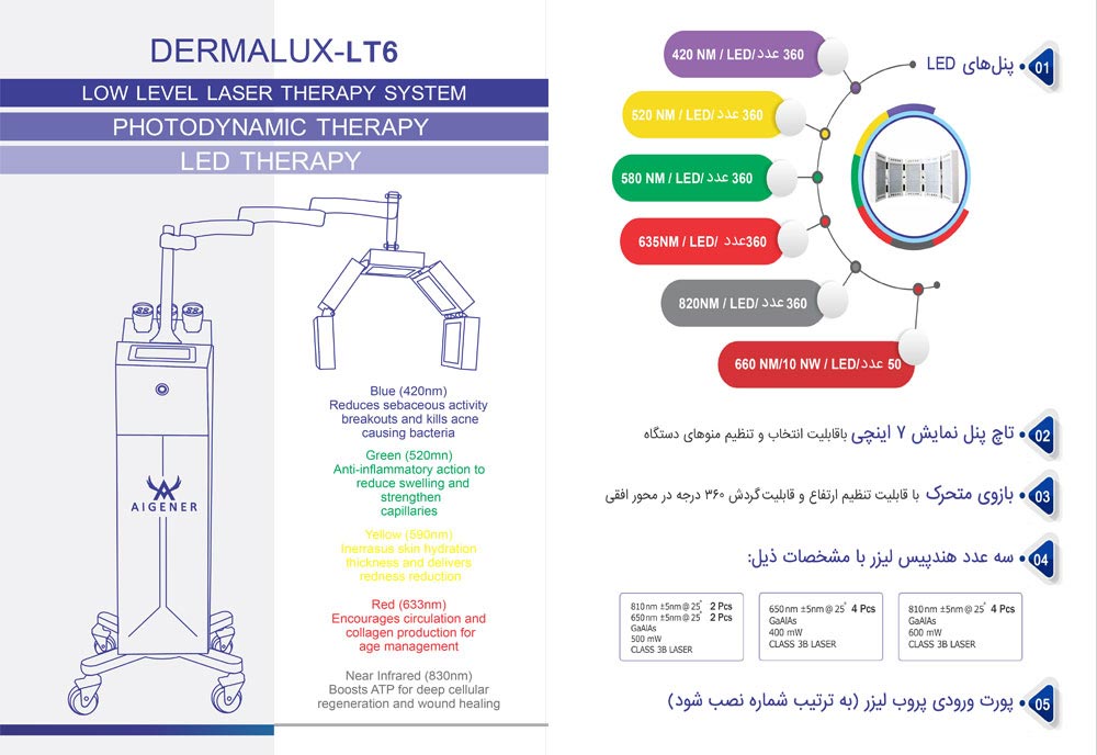 دستگاه LED تراپی درمالوکس یک ابزار پیشرفته، چندمنظوره و غیرتهاجمی برای ارتقاء خدمات کلینیکی است که با بهره‌گیری از نورهای تخصصی در طول‌ موج‌های مختلف (قرمز، آبی، سبز، زرد و مادون قرمز)، به بهبود طیف وسیعی از مشکلات پوستی و حتی درمان‌های مکمل مو و بدن کمک می‌کند.جهت مشاوره بیشتر می توانید با شماره 09126226687 در تماس باشد